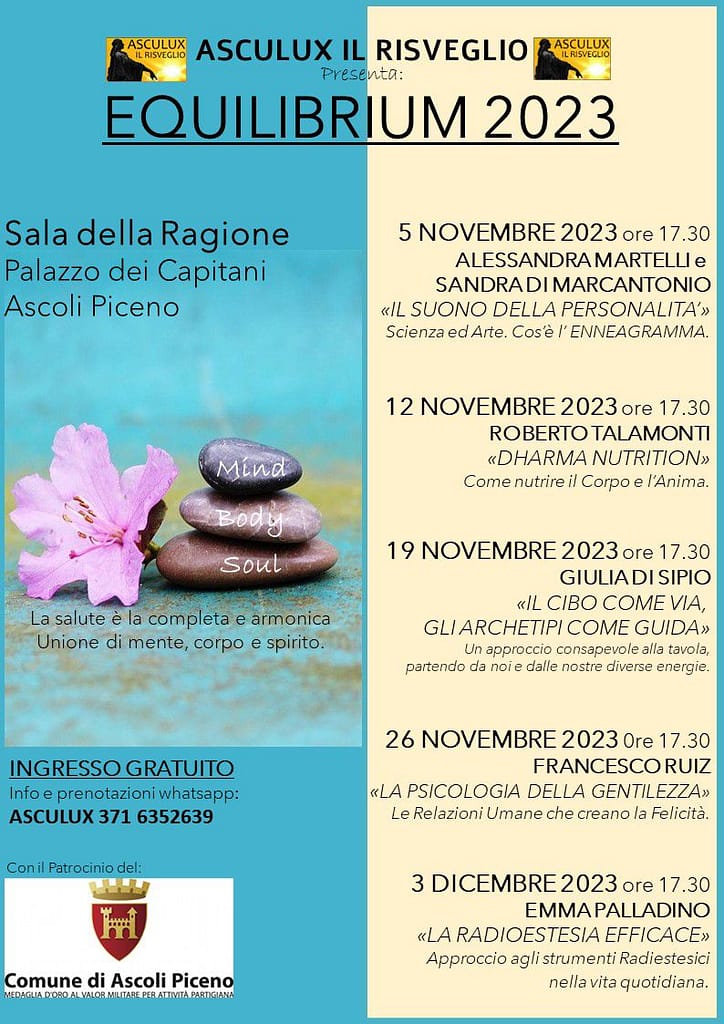 Se pensi che questo tema possa essere per te interessante e fonte di spunti di riflessione sui quali portare la tua attenzione, domenica 19 novembre alle ore 17 sarò ad Ascoli, presso il Palazzo dei Capitani. Ecco la locandina completa della manifestazione.