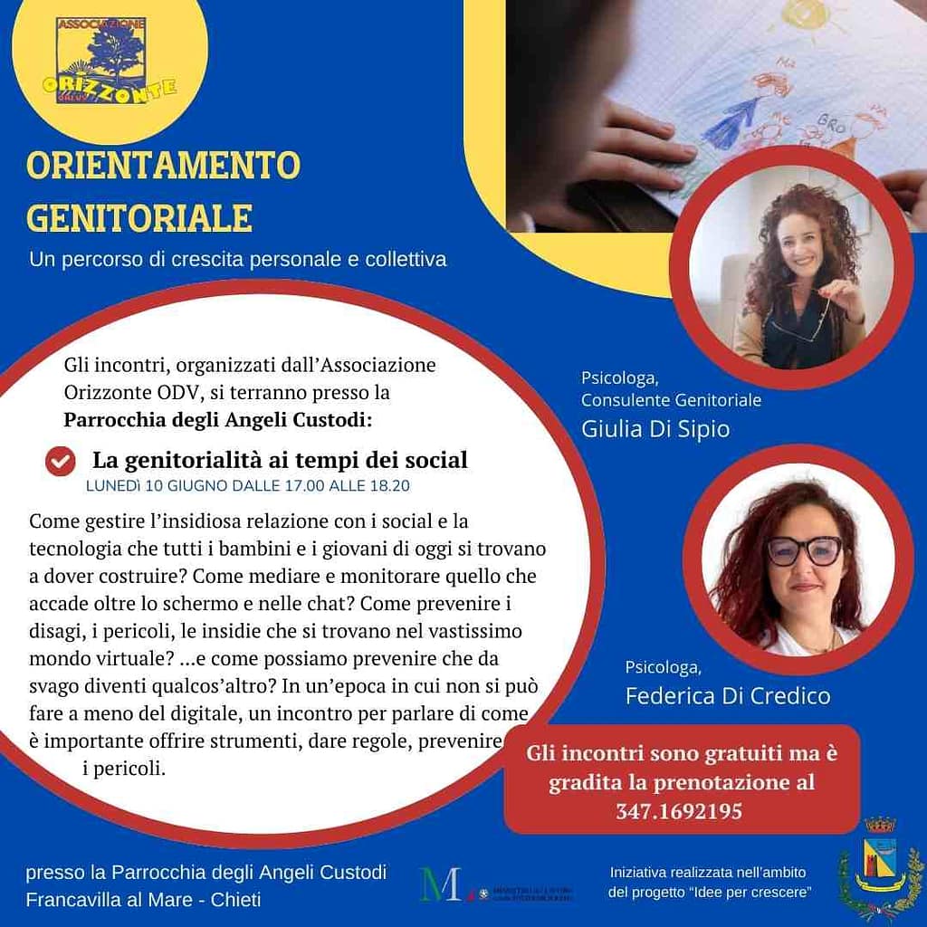 Nell’ambito del progetto finanziato dalla Regione Abruzzo e, in particolare, dal Ministero del Lavoro e delle Politiche Sociali, “Idee per crescere” ideato e presentato dall’Associazione Orizzonte ODV, Lunedì 10 giugno alle ore 17.00, presso la Sala Riunioni della Parrocchia degli Angeli Custodi, si terrà l’ultimo incontro del ciclo “Orientamento Genitoriale” a supporto delle famiglie e, in particolare dei giovani. Questa settimana l’appuntamento sarà particolarmente importante: “La genitorialità ai tempi dei social”, il titolo.