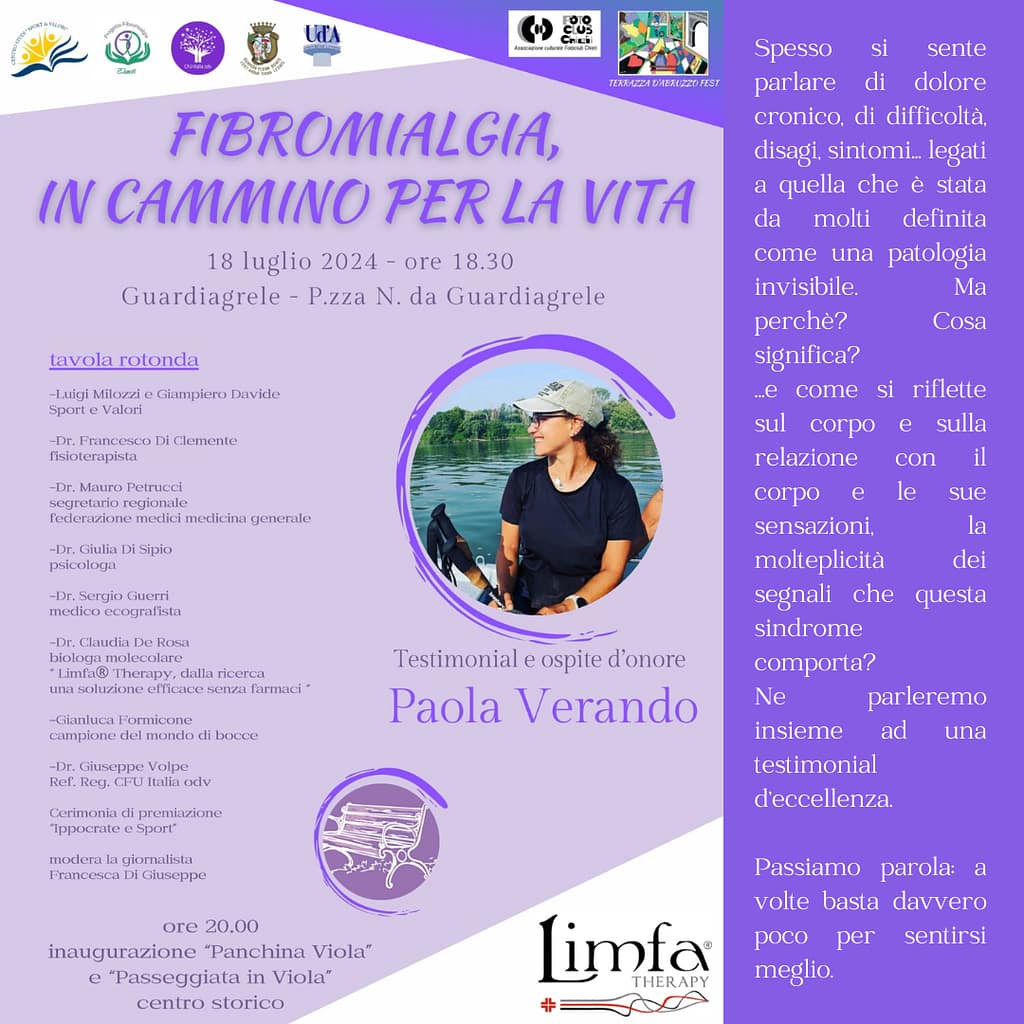 Se ne sente parlare ancora troppo poco della fibromialgia e anzi, spesso, chi ne soffre, nonostante le enormi ricerche, è ancora visto come un “malato immaginario”, una persona che quasi quasi “sceglie” di stare male, di sentire dolore, di non dormire, di sentirsi stanco. Per sensibilizzare la comunità, per scambiare impressioni e condivisioni, per portare l’attenzione sulle scoperte che ci sono state, per restituire dignità a chi soffre e ha bisogno di sostegno e spazio di ascolto alle persone loro care, io, insieme a Progetto Fibromialgia Ermes, Giovedì 18 Luglio, vi aspettiamo a Guardiagrele per un convegno che vedrà la straordinaria partecipazione di Paola Verando. Passiamo parola. Se vuoi saperne di più, CLICCA QUI.