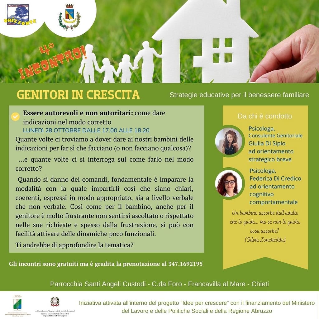 Torna Lunedì 28 ottobre, presso la Parrocchia degli Angeli Custodi di Francavilla al Mare, dalle ore 17.00 alle 18.20, l’appuntamento con la genitorialità nell’ambito del progetto Idee per Crescere presentato e portato avanti dall’Associazione Orizzonte ODV. Questa volta il tema sarà l’autorevolezza. Ti senti più autorevole o autoritario? Qual è la differenza? …e in che modo si riflette nella modalità con la quale ci si riferisce al prossimo e, in particolare, ai figli? Vediamolo insieme. Per avere maggiori informazioni, è possibile contattarmi al 347.1692195.
