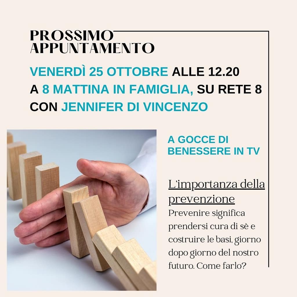 Venerdì 25 ottobre alle ore 12.20 circa, su Rete 8, all’interno del programma “8 Mattina in Famiglia”, con Jennifer Di Vincenzo, torna Gocce di Benessere in TV. Questa volta la tematica che verrà affrontata sarà “L’importanza della prevenzione”, un argomento importantissimo per iniziare ad intervenire in anticipo rispetto ai nostri disagi e malanni. Tutte le puntate è possibile rivederle sul canale Youtube di Rete 8 raggiungibile QUI.