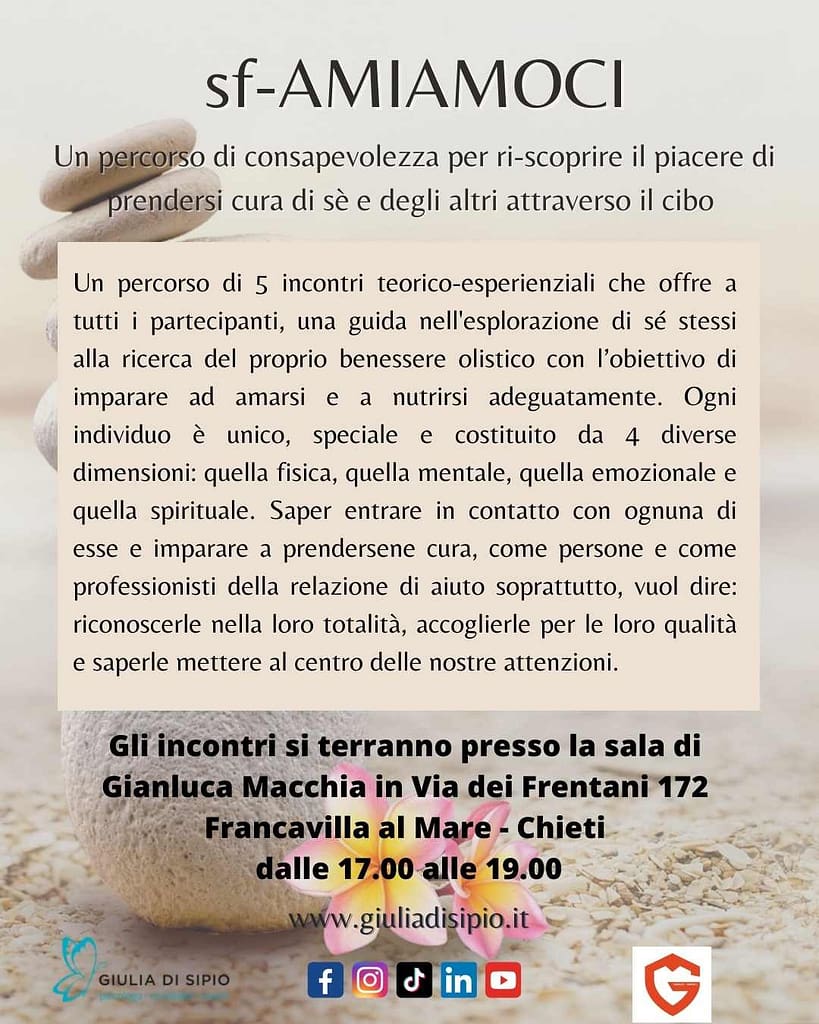 In uno spazio protetto, a Francavilla al Mare, ti aspetto per un percorso di cinque incontri durante i quali esploreremo come le diverse dimensioni di noi – quella fisica, emotiva, mentale e spirituale – concorrono nella relazione che ogni giorno coltiviamo con noi stessi e con il nostro modo di nutrirci.