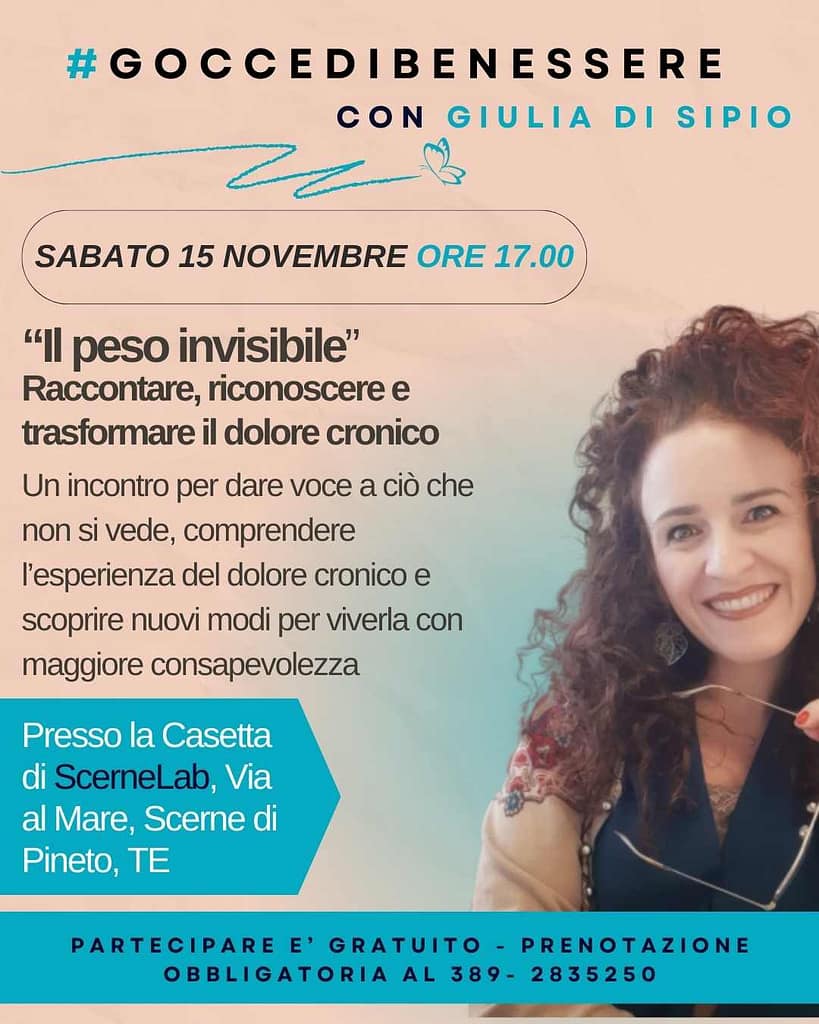 📌 𝐒𝐚𝐛𝐚𝐭𝐨 𝟏𝟓 𝐧𝐨𝐯𝐞𝐦𝐛𝐫𝐞 𝐚𝐥𝐥𝐞 𝐨𝐫𝐞 𝟏𝟕.𝟎𝟎, alla Casetta di ScerneLab (Scerne di Pineto, TE), sei invitat* per dare voce a questo “peso invisibile”. Per comprendere insieme l’esperienza del dolore cronico e scoprire nuovi modi per viverla con maggiore #consapevolezza e #compassione.