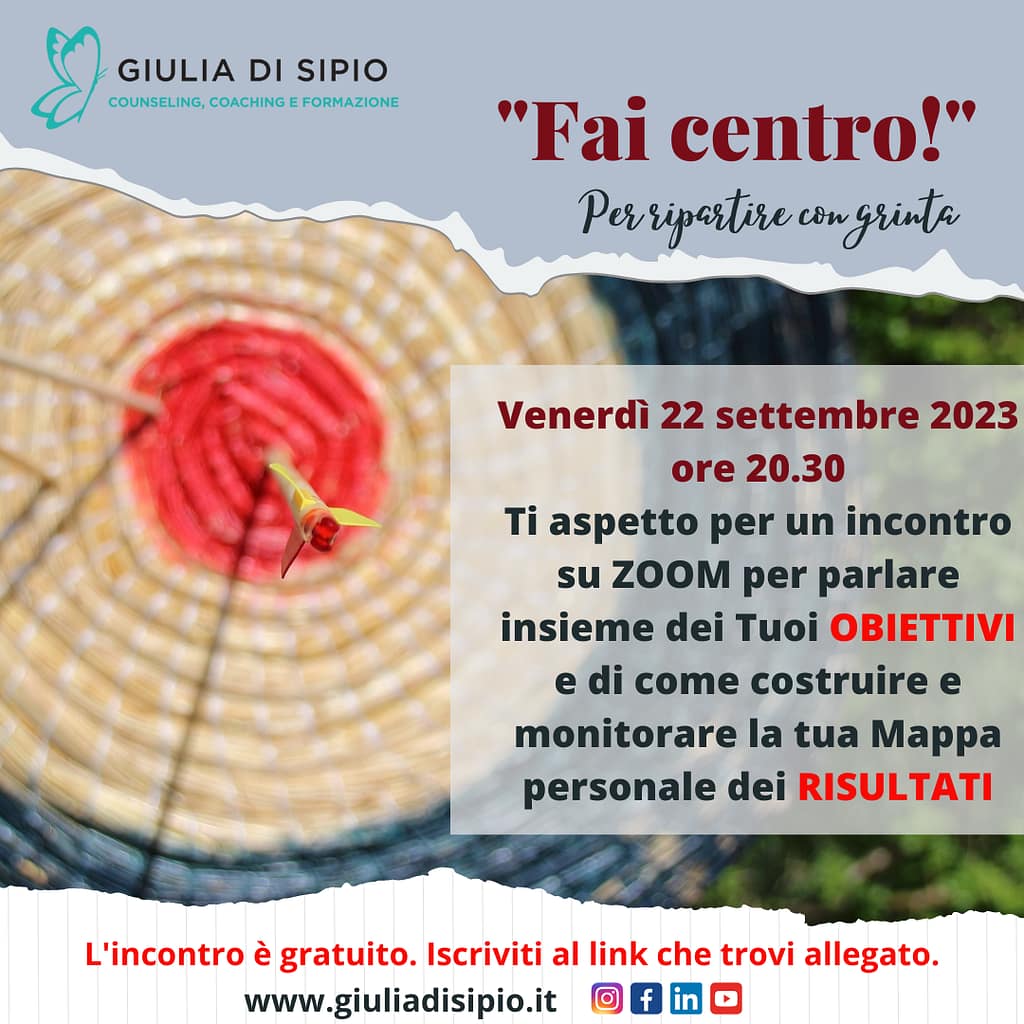 Non sempre è facile raggiungere i propri obiettivi, anzi! Spesso già la loro individuazione è complessa. Per facilitarti nel capire in quale direzione vorresti andare, quale andatura seguire e con quali strumenti equipaggiarti, il 22 settembre ti aspetto su ZOOM per una serata insieme. Contattami per avere maggiori informazioni. L’incontro, completamente gratuito ti permetterà di comprendere che cosa è una “Mappa degli obiettivi”, come la si costruisce, quali sono le criticità, come aggirare gli ostacoli, quali strategie adoperare.